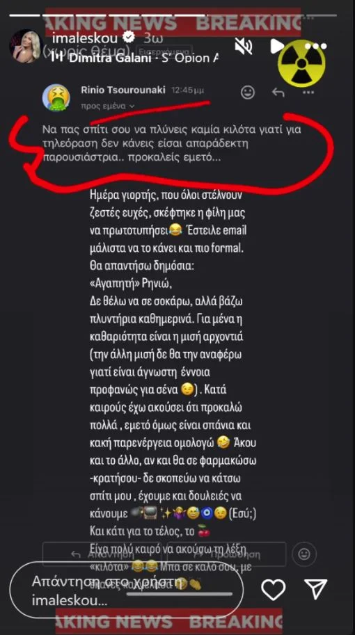«Ημέρα γιορτής, που όλοι στέλνουν ζεστές ευχές, σκέφτηκε η φίλη μας να πρωτοτυπήσει. Έστειλε email μάλιστα να το κάνει και πιο επίσημο. Θα απαντήσω δημόσια: “Αγαπητή” Ρηνιώ, δεν θέλω να σε σοκάρω αλλά βάζω πλυντήρια καθημερινά. Για μένα η καθαρότητα είναι η μισή αρχοντιά (την άλλη μισή δεν θα την αναφέρω γιατί είναι άγνωστη έννοια προφανώς για εσένα.