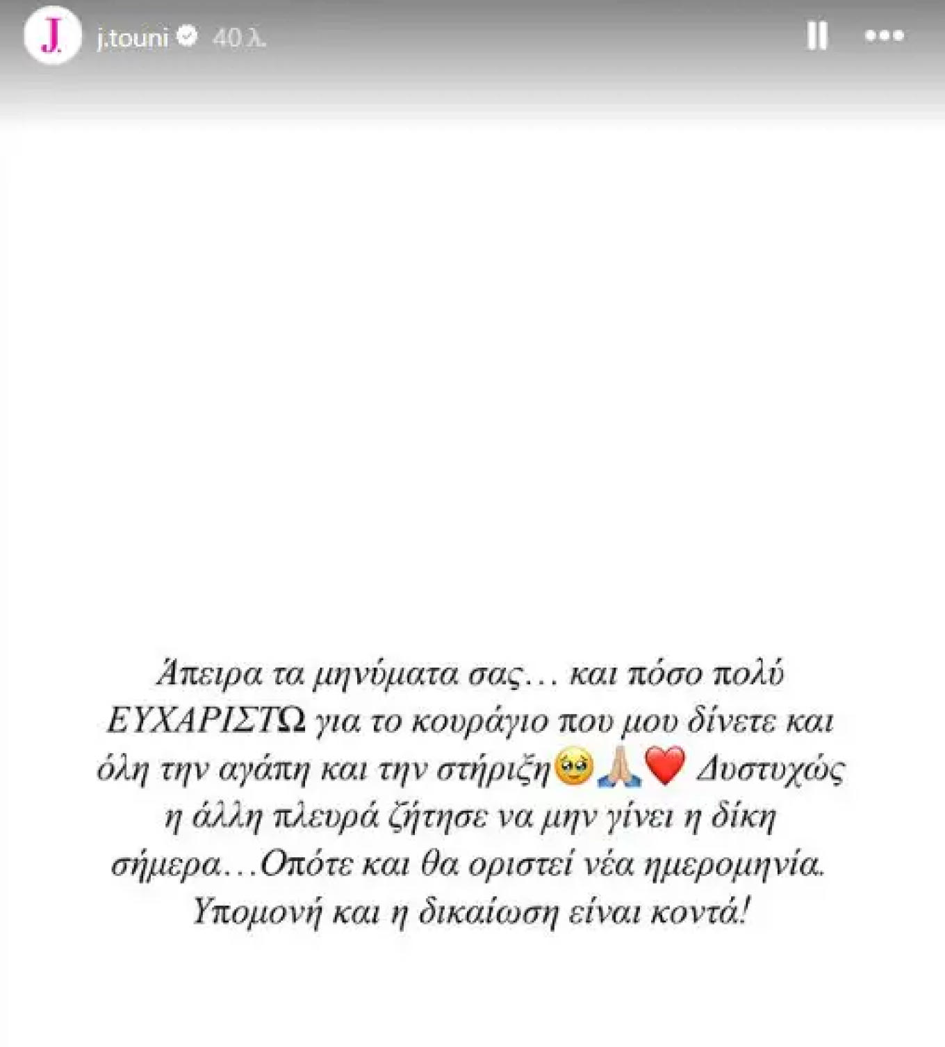 «Άπειρα τα μηνύματά σας… και πόσο πολύ ευχαριστώ για το κουράγιο που μου δίνετε και όλη την αγάπη και την στήριξη. Δυστυχώς η άλλη πλευρά ζήτησε να μην γίνει η δίκη σήμερα. Οπότε και θα οριστεί νέα ημερομηνία. Υπομονή και η δικαίωση είναι κοντά», έγραψε η Ιωάννα Τούνη.