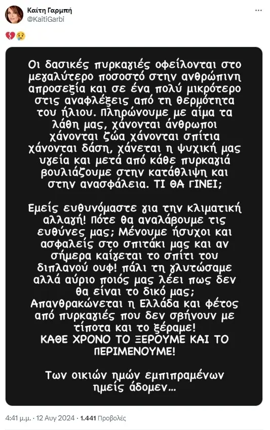 Απανθρακώνεται η Ελλάδα και φέτος από πυρκαγιές που δεν σβήνουν με τίποτα και το ξέραμε! Κάθε χρόνο το ξέρουμε και το περιμένουμε! Των οικιών ημών εμπιπραμένων ημείς άδομεν…», έγραψε στη συνέχεια η Καίτη Γαρμπή σε tweet στο X/ Twitter.