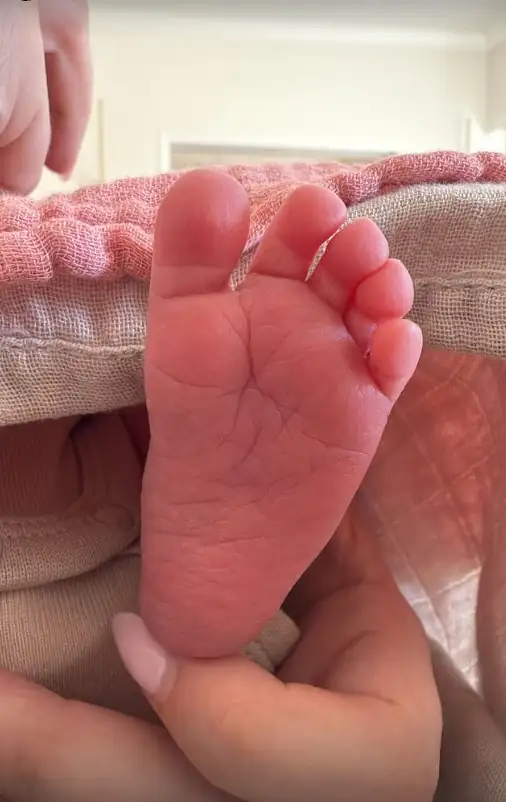 Στη φωτογραφία που δημοσιεύτηκε η παρουσιάστρια φαίνεται να κρατάει στην αγκαλιά της το μωρό της, με τον επιχειρηματία να μοιράζεται την… πατούσα της μπέμπας του.
