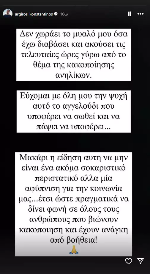 Μακάρι η είδηση αυτή να μην είναι ένα ακόμη σοκαριστικό περιστατικό, αλλά μια αφύπνιση για την κοινωνία μας… έτσι ώστε πραγματικά να δίνει φωνή σε όλους τους ανθρώπους που βιώνουν κακοποίηση και έχουν ανάγκη από βοήθεια», έγραψε στην ανάρτησή του ο Κωνσταντίνος Αργυρός.