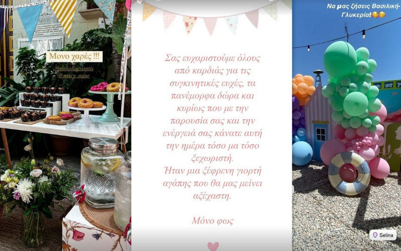 Αυτό που δεν είχε αποκαλύψει, γιατί δεν το γνώριζε κιόλας, είναι το απίστευτο κέφι όλων στη βάφτιση της μικρής. Τους ατέλειωτους χορούς, τα τραγούδια αλλά και το ίδιο το ζευγάρι να χορεύει μαζί με τη νεοφώτιστη αλλά και όλους τους καλεσμένους το πασίγνωστο «Βασιλική» αφιερωμένο στο κορίτσι τους.