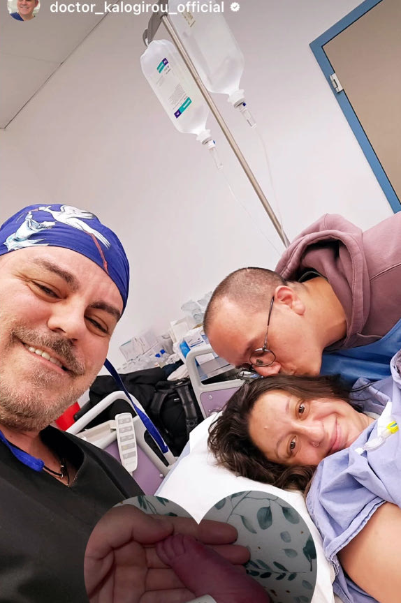 Στη φωτογραφία ποζάρουν χαμογελαστοί στο μαιευτήριο. Στο ίδιο στιγμιότυπο έχει προστεθεί και ένα μικρότερο σε σχήμα καρδιάς, στο οποίο φαίνεται το πόδι του νεογέννητου μωρού.