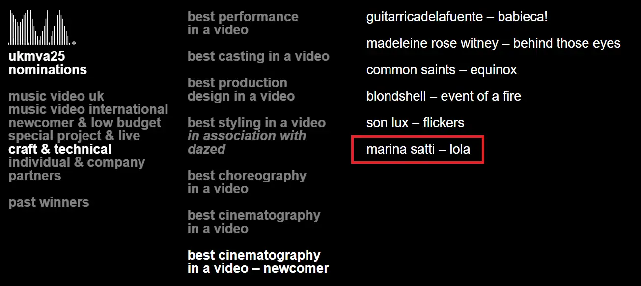 Η πρώτη φορά ήταν το 2022 με το “YIATI POULI’M” στην κατηγορία Best Alternative Video – Newcomer και τώρα, το 2025, έρχεται με το “LOLA” στην κατηγορία Craft & Technical: Best Cinematography in a Video – Newcomer.