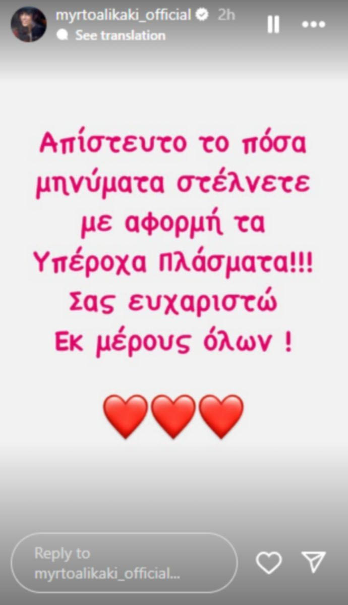 Στο τέλος του βίντεο, η ηθοποιός έδειξε το νέο της hair look και στη συνέχεια μοιράστηκε με τους followers της το αποτέλεσμα. «Τα “Υπέροχα Πλάσματα” θα είναι μαζί σας του χρόνου, καλώς εχόντων των πραγμάτων θα ξεκινήσουμε γυρίσματα τον Γενάρη! Σας ευχαριστούμε για την απίστευτη ανταπόκριση! Εγώ σιγά σιγά μεταμορφώνομαι σε Μητσάκι!» ανέφερε η Μυρτώ Αλικάκη μέσα από την ανάρτησή της.