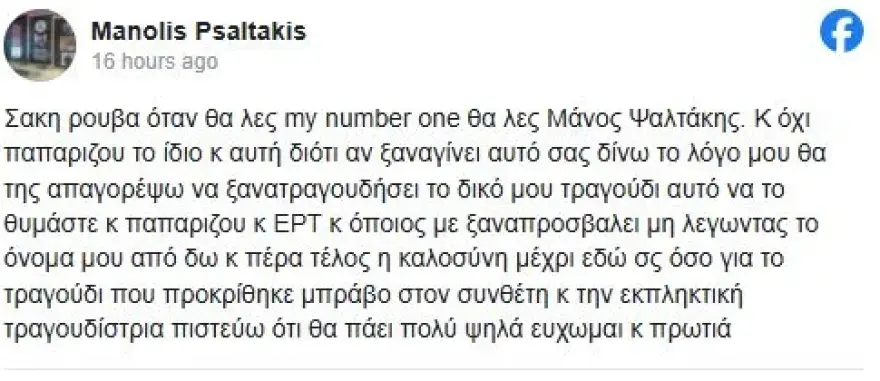 «Σάκη Ρουβά όταν θα λες “Μy number one”, θα λες Μάνος Ψαλτάκης και όχι Παπαρίζου, το ίδιο και αυτή διότι αν ξαναγίνει αυτό, σας δίνω τον λόγο μου θα της απαγορεύσω να ξανατραγουδήσει το δικό μου τραγούδι, αυτό να το θυμάστε και Παπαρίζου και ΕΡΤ και όποιος με ξαναπροσβάλλει μη λέγοντας το όνομά μου», είχε γράψει στον προσωπικό του λογαριασμό στο Facebook.