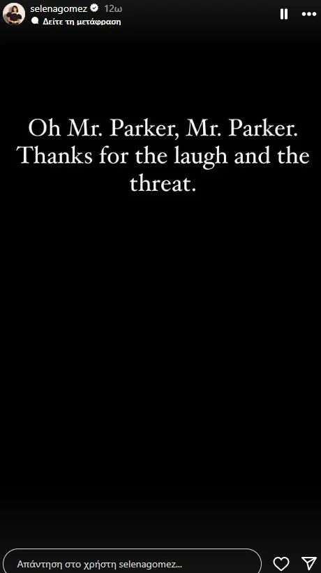 Η απάντηση από την Γκόμεζ, ήρθε άμεσα. Με ένα story στο Instagram της, που μετρά 422 εκατομμύρια ακολούθους, η τραγουδίστρια και ηθοποιός έγραψε ειρωνικά: «Κύριε Πάρκερ, κύριε Πάρκερ. Ευχαριστώ για το γέλιο και την απειλή».