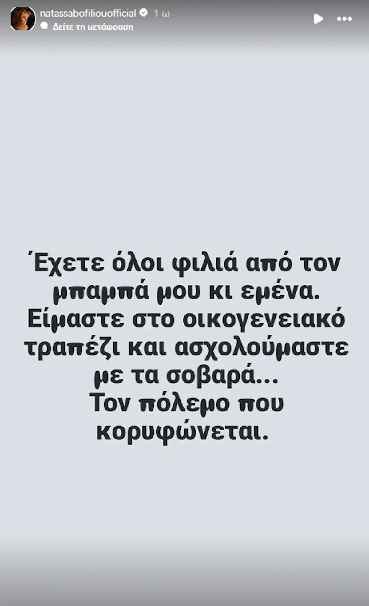 «Έχετε όλοι φιλιά από τον μπαμπά μου κι εμένα. Είμαστε στο οικογενειακό τραπέζι και ασχολούμαστε με τα σοβαρά… Τον πόλεμο που κορυφώνεται», στην ανάρτησή της η Νατάσσα Μποφίλιου.