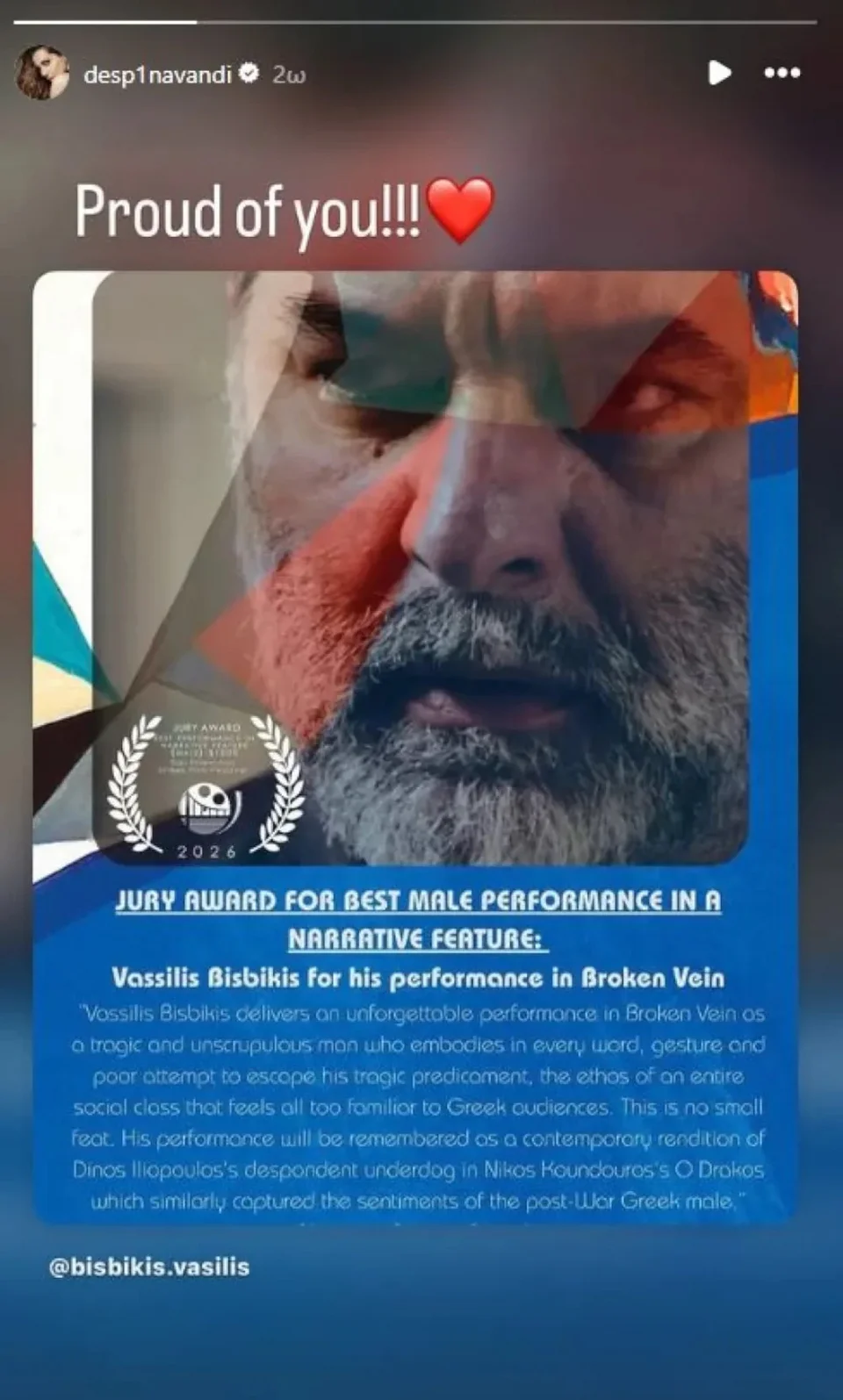 Άμεση ήταν η αντίδραση της Δέσποινας Βανδή, η οποία δήλωσε περήφανη για τον σύντροφό της. Ο ηθοποιός απέσπασε το «Βραβείο Επιτροπής για Καλύτερη Ανδρική Ερμηνεία σε ταινία μυθοπλασίας» στο San Francisco Greek Film Festival 2026.