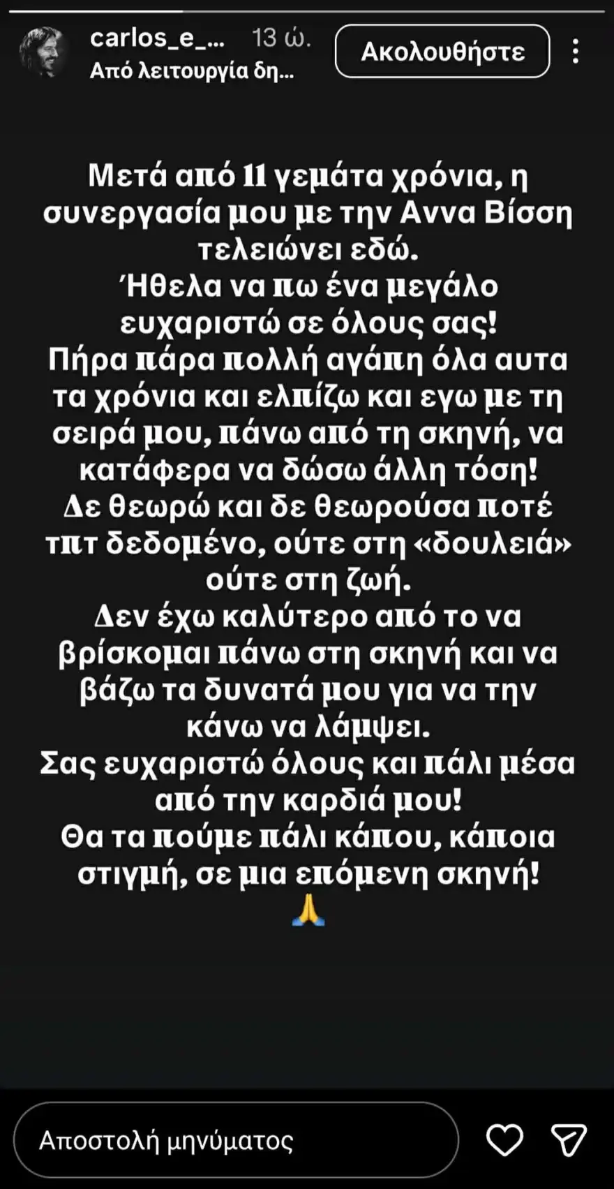 «Μετά από 11 γεμάτα χρόνια, η συνεργασία μου με την Άννα Βίσση τελειώνει εδώ.