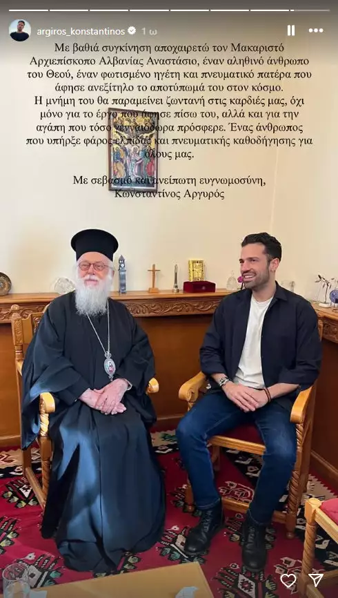 Λίγες ώρες νωρίτερα ο δημοφιλής τραγουδιστής αποχαιρέτησε στον Αρχιεπίσκοπο Αλβανίας δημοσιεύοντας φωτογραφία από την ημέρα της συνάντησής τους.