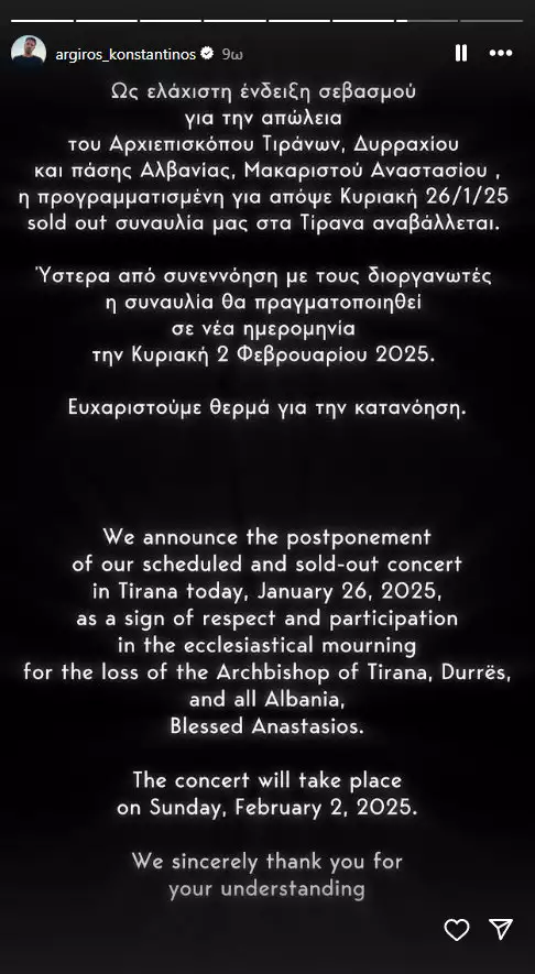 «Ως ελάχιστη ένδειξη σεβασμού για την απώλεια του Αρχιεπισκόπου Τιράνων, Δυρραχίου και πάσης Αλβανίας, Μακαρίστου Αναστασίου, η προγραμματισμένη για απόψε Κυριακή 26/1/25 sold out συναυλία μας στα Τίρανα αναβάλλεται.