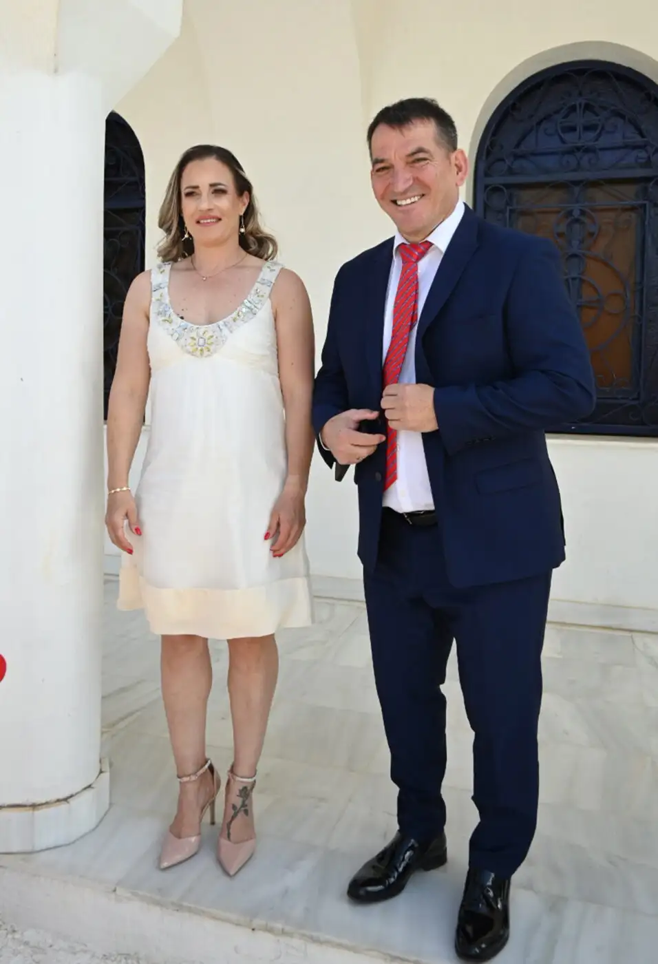 Όπως θα είδες και από τις φωτογραφίες, η Αφροδίτη Σκαφίδα επέλεξε ένα αμάνικο λευκό φόρεμα μέχρι το γόνατο με γυαλιστερές πέτρες στο μπούστο το οποίο συνδύασε με μπεζ παπούτσια. Ο Πύρρος Δήμας από την άλλη φόρεσε ένα μπλε κοστούμι με κόκκινη γραβάτα.