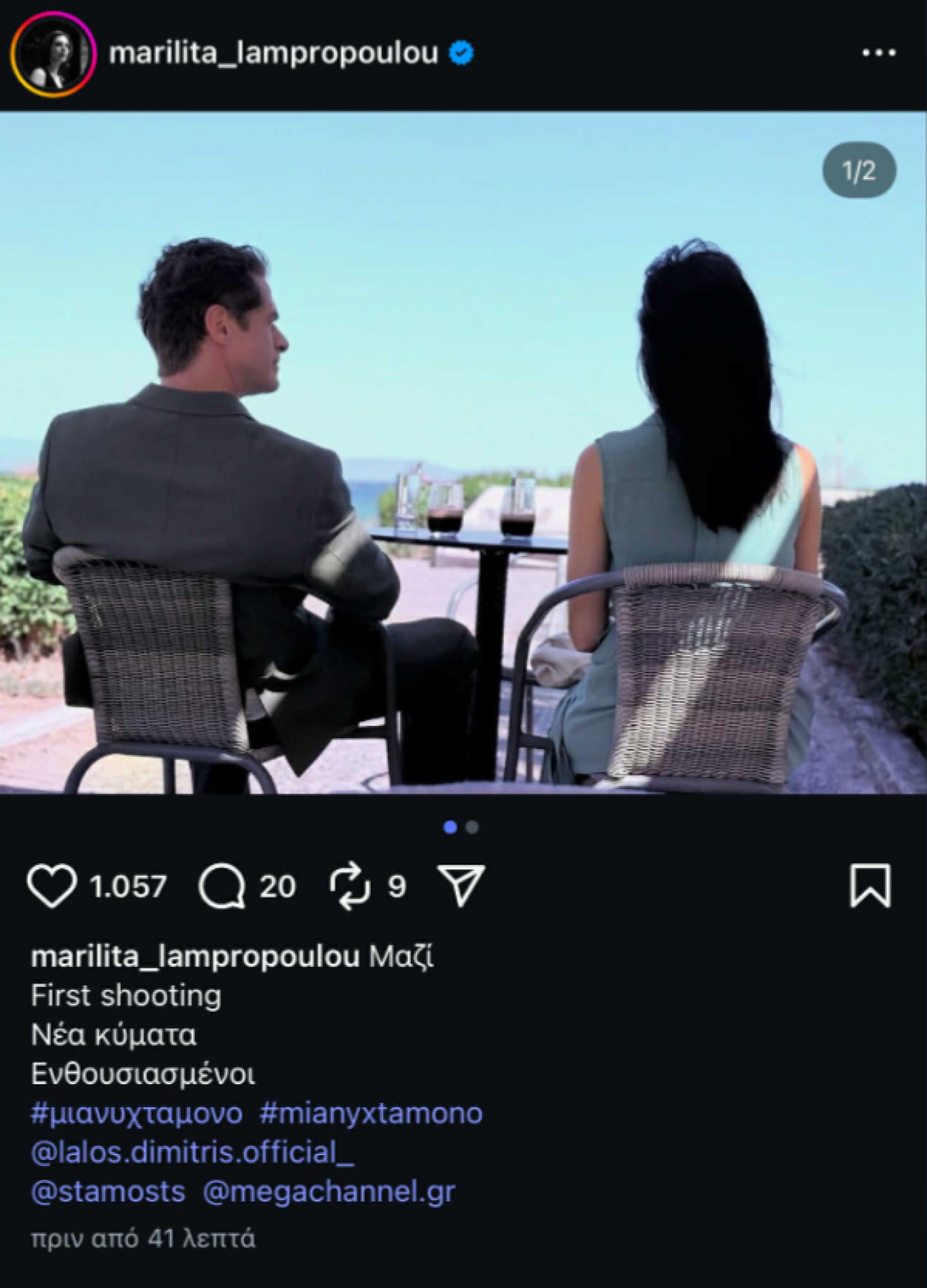 Δύο φωτογραφίες με τη Μαριλίτα Λαμπροπούλου δημοσίευσε ο Δημήτρης Λάλος στα social media, με αφορμή την έναρξη των γυρισμάτων της σειράς «Μία Νύχτα Μόνο», όπου θα συμπρωταγωνιστήσουν.
