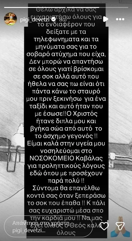 Ο Χριστός ήταν δίπλα μου και βγήκα σώα από αυτό το άσχημο γεγονός. Είμαι καλά στην υγεία μου, νοσηλεύομαι στο νοσοκομείο Καβάλας για προληπτικούς λόγους εδώ όπου με προσέχουν πάρα πολύ», έγραψε η Πηγή Δεβετζή στο σε story στο Instagram.