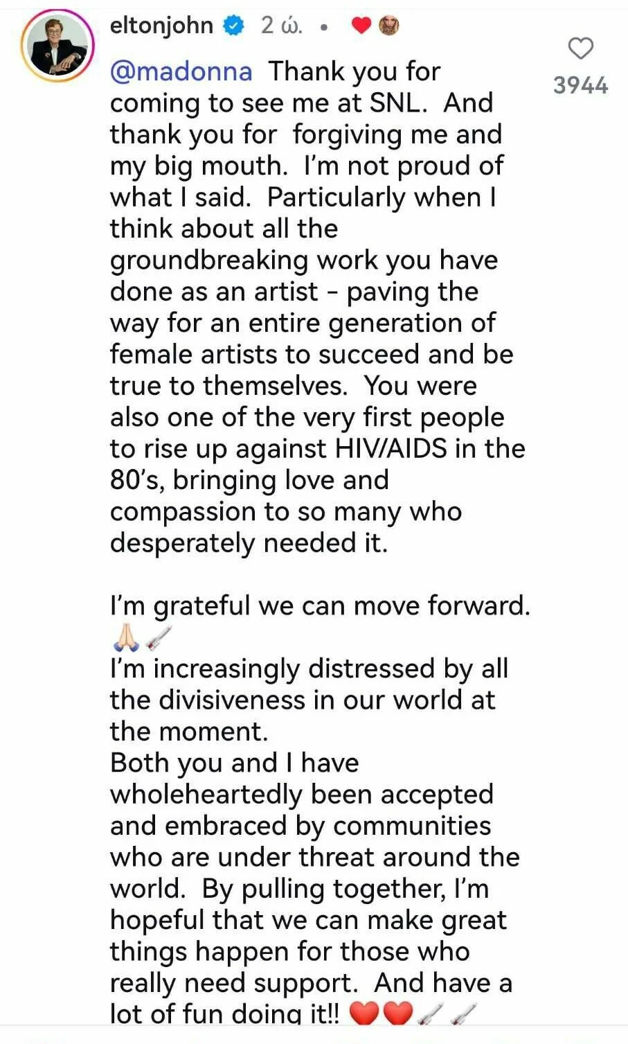 Ο Έλτον Τζον σχολίασε: «Σε ευχαριστώ που ήρθες να με δεις στο SNL. Και σε ευχαριστώ που με συγχώρησες για το μεγάλο μου στόμα. Δεν είμαι περήφανος για όσα είπα. Ιδιαίτερα όταν σκέφτομαι όλο το πρωτοποριακό έργο που έχεις κάνει ως καλλιτέχνης – ανοίγοντας το δρόμο για μια ολόκληρη γενιά γυναικών καλλιτεχνών να πετύχουν και να είναι αληθινές στον εαυτό τους. Ήσουν επίσης ένας από τους πρώτους ανθρώπους που ξεσηκώθηκαν ενάντια στο HIV/AIDS τη δεκαετία του ’80, φέρνοντας αγάπη και συμπόνια σε τόσους πολλούς που το είχαν απεγνωσμένα ανάγκη.