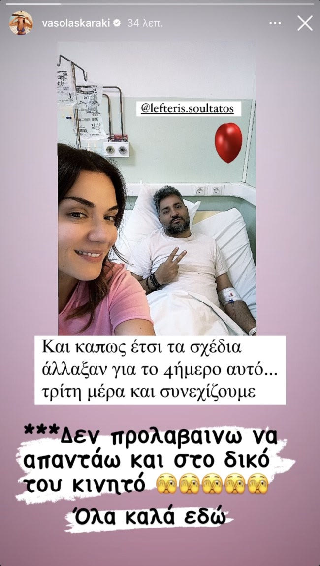Συγκεκριμένα η ηθοποιός δημοσίευσε μία φωτογραφία στην οποία βλέπουμε τον Λευτέρη Σουλτάτο να βρίσκεται στο κρεβάτι του νοσοκομείου. Αξίζει να σημειωθεί πως σύμφωνα με τα όσα έγραψε στην ανάρτησή της η Βάσω Λασκαράκη, αυτή είναι η τρίτη μέρα που ο σεφ νοσηλεύεται στο νοσοκομείο.