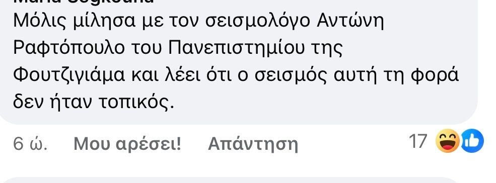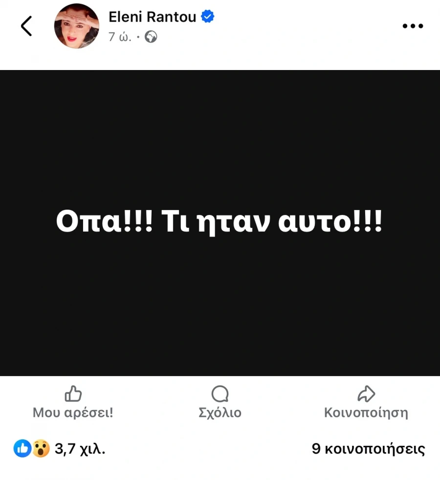 Ανάμεσα σε όσους έσπευσαν στα social media για να επιβεβαιώσουν ότι ένιωσαν για τα καλά το τράνταγμα του σεισμού αυτού ήταν και η Ελένη Ράντου, η οποία έγραψε: «Ωπα! Τι ήταν αυτό;».