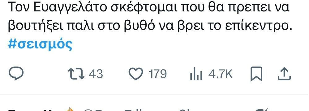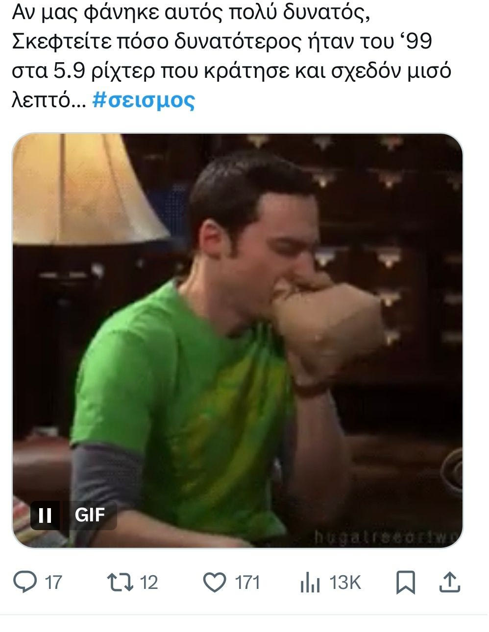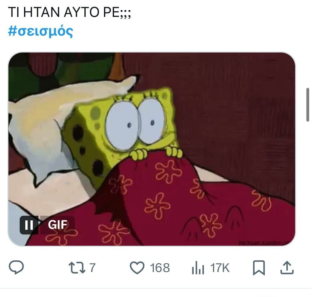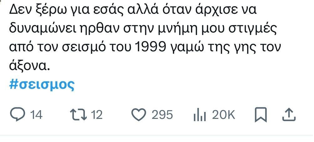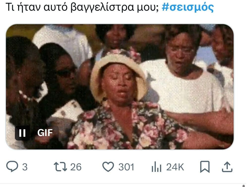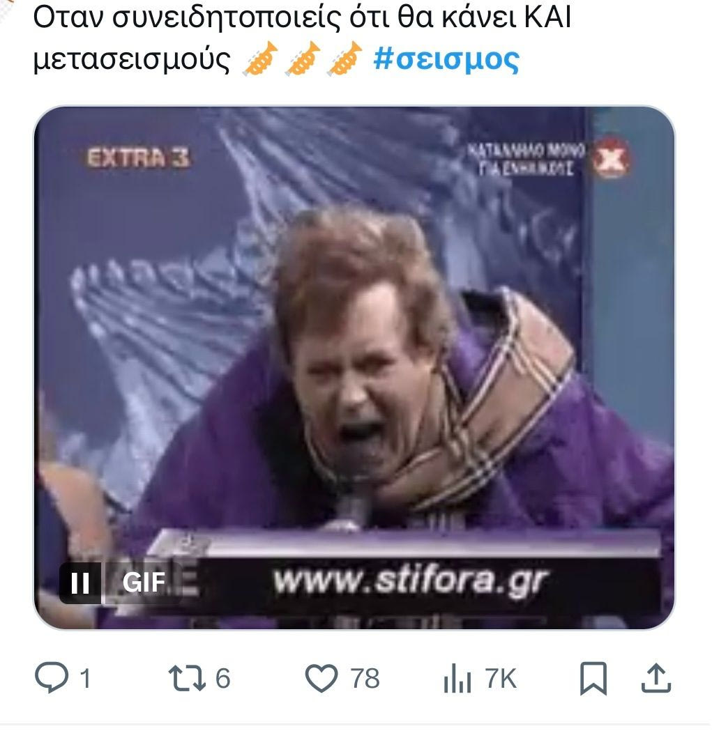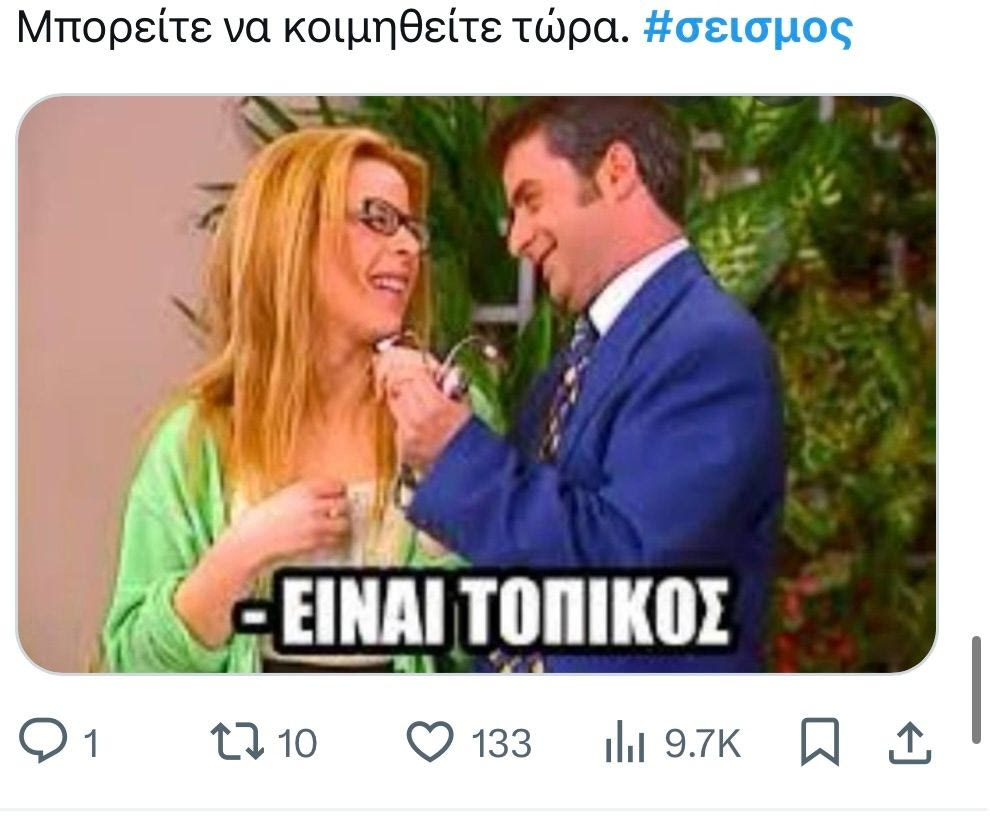 Πάντως το #σεισμος έγινε Νo1 trend και στο Χ. Όπως θα δεις κι εκεί δεν έλειψαν τα memes και οι εικόνες από την ελληνική τηλεόραση που ταίριαζαν στην περίσταση. Αν μη τι άλλο, όπως έγραψε και μια χρήστης της εφαρμογής παλιά όταν γινόταν σεισμός έβγαινες για λίγο έξω στη γειτονιά να μοιραστείς την αγωνία και τον φόβο σου – τώρα μπαίνεις στα social!