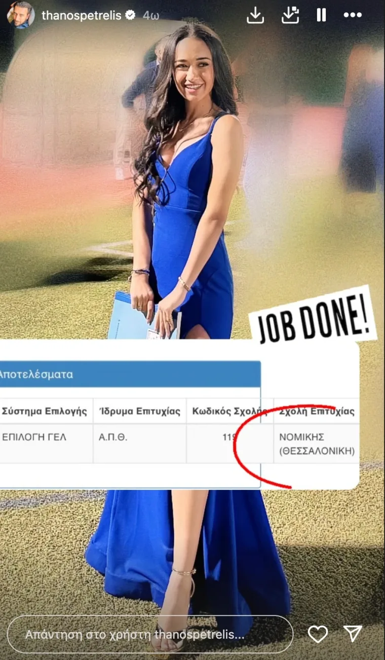 Όπως έκανε γνωστό ο ίδιος ο τραγουδιστής μέσα από μία ανάρτηση στον προσωπικό του λογαριασμό στο Instagram, η κούκλα κόρη του πέρασε στη Νομική Σχολή Θεσσαλονίκης (ΑΠΘ).