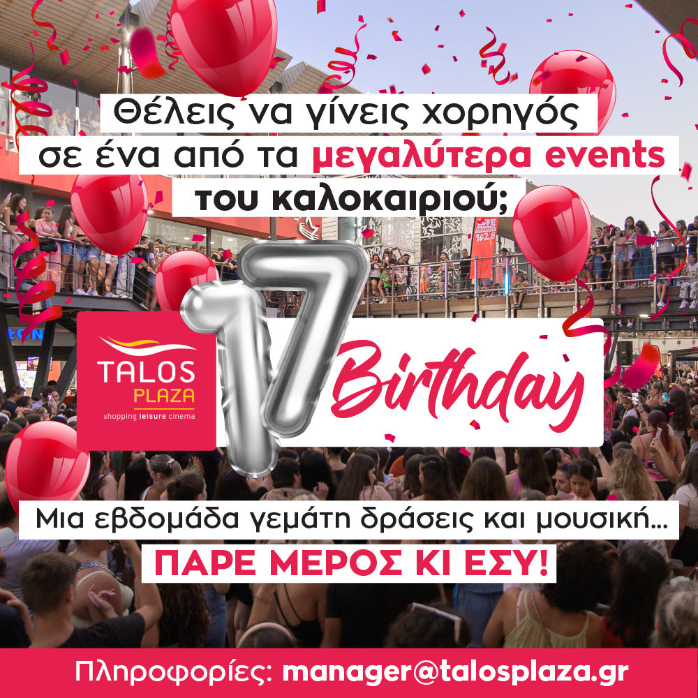 Tα 17α γενέθλια του γιορτάζει το Τalos Plaza τον Ιούλιο με ένα από τα μεγαλύτερα events του καλοκαιριού που θα λάβει χώρα τον Ιούλιο.