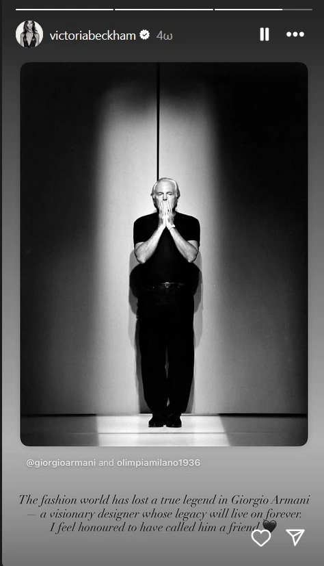 «Ο κόσμος της μόδας έχασε έναν πραγματικό θρύλο, τον Τζιόρτζιο Αρμάνι — έναν οραματιστή σχεδιαστή, η κληρονομιά του οποίου θα ζει για πάντα. Νιώθω τιμή που τον αποκαλούσα φίλο μου», έγραψε το πρώην μέλος των Spice Girls με story της στο Instagram.