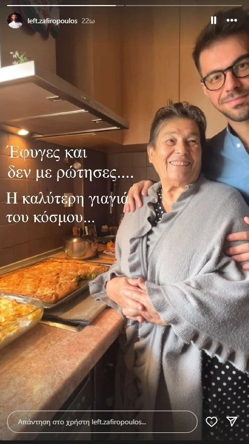 Η γιαγιά του, Ερμιόνη, έφυγε από τη ζωή, σκορπίζοντας θλίψη σε όλη την οικογένεια. «Έφυγες και δεν με ρώτησες… Η καλύτερη γιαγιά του κόσμου», έγραψε αρχικά ο Λευτέρης Ζαφειρόπουλος δημοσιεύοντας φωτογραφία από την κουζίνα με την γιαγιά του.