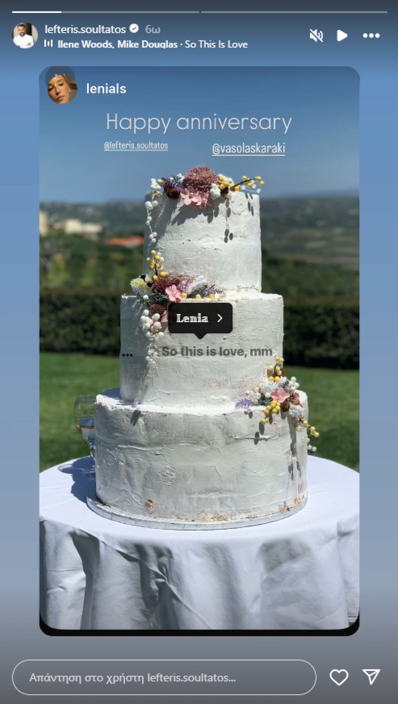 Με τη σειρά του, ο Λευτέρης Σουλτάτος αναδημοσίευσε την ανάρτησή της στον προσωπικό του λογαριασμό στο Instagram, ενώ ανέβασε σε story και τη γαμήλια τούρτα τους.