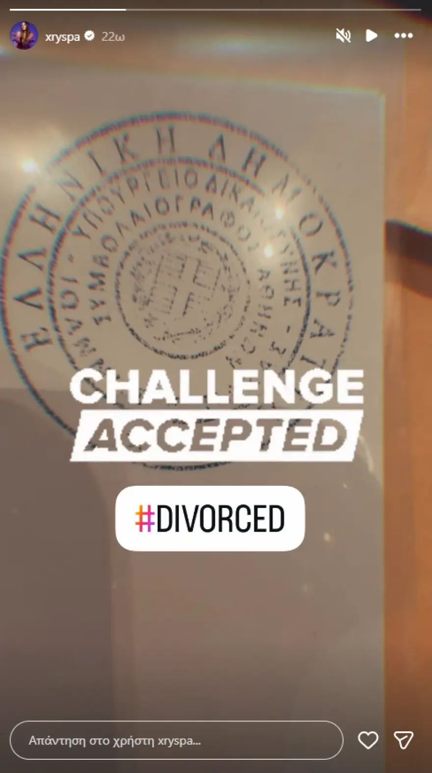 Ήταν Τρίτη 11 Νοεμβρίου όταν βγήκε το διαζύγιο της τραγουδίστριας και του Παναγιώτη Νικολάου. Η Χρύσπα το ανακοίνωσε δημοσιεύοντας στον προσωπικό της λογαριασμό στο Instagram ένα story, στο οποίο φαίνεται η σφραγίδα ενός συμβολαιογράφου. Πάνω στη φωτογραφία, έγραψε: «Αποδέχομαι την πρόκληση. Χωρισμένη».