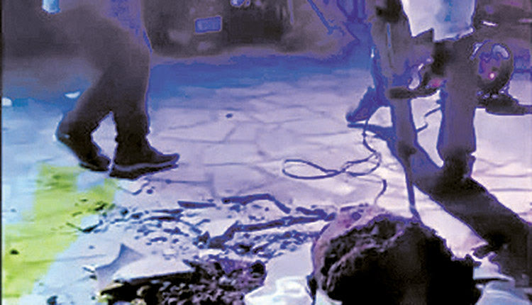 Την ώρα που ένας άντρας χορεύει ζεϊμπέκικο στην υπαίθρια πίστα, κάποιος άλλος φαίνεται πως δεν αρκέστηκε στα πιάτα, που συνηθίζουν να σπάνε ως έθιμο στα γλέντια, αλλά φρόντισε πάνω στο τσακίρ κέφι να ξηλώσει ακόμα και τις πέτρινες πλάκες του χώρου, με τη βοήθεια ενός κομπρεσέρ!