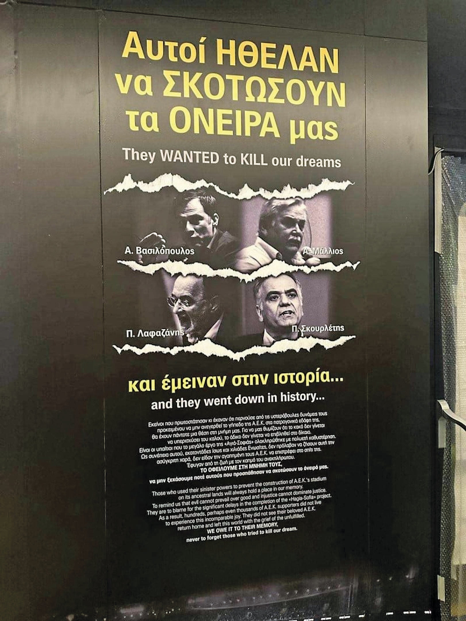 Την αντίδρασή της εξέφρασε η Νέα Αριστερά σχετικά με φωτογραφία στο Μουσείο Ιστορίας της ΑΕΚ, που στοχοποιεί δύο πρώην υπουργούς της κυβέρνησης ΣΥΡΙΖΑ. Συγκεκριμένα, η ΠΑΕ ΑΕΚ έχει τοποθετήσει σε έκθεμα τα πρόσωπα των τότε υπουργών Παραγωγικής Ανασυγκρότησης και Ενέργειας, Παναγιώτη Λαφαζάνη και Πάνου Σκουρλέτη, αλλά και του τότε δημάρχου Νέας Φιλαδέλφειας, Άρη Βασιλόπουλου, και του δημοτικού συμβούλου Θανάση Μάλλιου, χρεώνοντάς τους την καθυστέρηση στην υλοποίηση της κατασκευής του νέου γηπέδου. ´Αυτοί ΗΘΕΛΑΝ να ΣΚΟΤΩΣΟΥΝ τα ΟΝΕΙΡΑ μας» αναγράφεται στο έκθεμα.