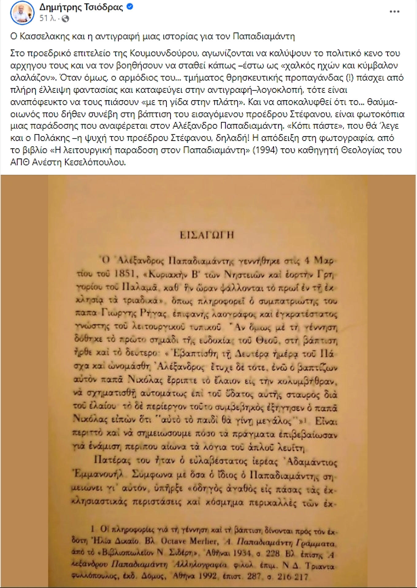Δηλαδή δεν υπήρξε το όραμα του Κασσελάκη; Έτσι λέει ο διευθυντής του γραφείου τύπου του πρωθυπουργού και υποψήφιος ευρωβουλευτής της ΝΔ Δημήτρης Τσιόδρας για το «θαύμα – οιωνό» το οποίο περιέγραψε ο πρόεδρος του ΣΥΡΙΖΑ στις ΗΠΑ. Συγκεκριμένα είπε πως δεν είναι τίποτα άλλο παρά μια αντιγραφή – λογοκλοπή μιας ιστορίας για τον Παπαδιαμάντη! Και παραθέτει μάλιστα και τη σχετική φωτογραφία από το βιβλίο «Η λειτουργική παράδοση στον Παπαδιαμάντη» (1994) του καθηγητή Θεολογίας του ΑΠΘ Ανέστη Κεσελόπουλου. Συγκεκριμένα στην ανάρτησή του με τίτλο «Ο Κασσελάκης και η αντιγραφή μιας ιστορίας για τον Παπαδιαμάντη» ο Δημήτρης Τσιόδρας αναφέρει: «Στο προεδρικό επιτελείο της Κουμουνδούρου, αγωνίζονται να καλύψουν το πολιτικό κενό του αρχηγού τους και να τον βοηθήσουν να σταθεί κάπως –έστω ως ìχαλκός ηχών και κύμβαλον αλαλάζονî. Όταν όμως, ο αρμόδιος του… τμήματος θρησκευτικής προπαγάνδας (!) πάσχει από πλήρη έλλειψη φαντασίας και καταφεύγει στην αντιγραφή–λογοκλοπή, τότε είναι αναπόφευκτο να τους πιάσουν ìμε τη γίδα στην πλάτηî. Και να αποκαλυφθεί ότι το… θαύμα-οιωνός που δήθεν συνέβη στη βάπτιση του εισαγόμενου προέδρου Στέφανου είναι φωτοκόπια μιας παράδοσης που αναφέρεται στον Αλέξανδρο Παπαδιαμάντη. «Κόπι πάστε», που θά ‘λεγε και ο Πολάκης –η ψυχή του προέδρου Στέφανου, δηλαδή! Η απόδειξη στη φωτογραφία, από το βιβλίο ì Η λειτουργική παράδοση στον Παπαδιαμάντηî (1994) του καθηγητή Θεολογίας του ΑΠΘ Ανέστη Κεσελόπουλου».