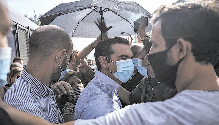 Άνδρες της ασφάλειας του προέδρου του ΣΥΡΙΖΑ άνοιξαν μια ομπρέλα ώστε να προφυλάξουν τον κ. Τσίπρα από τη ρίψη νερών και καφέδων.