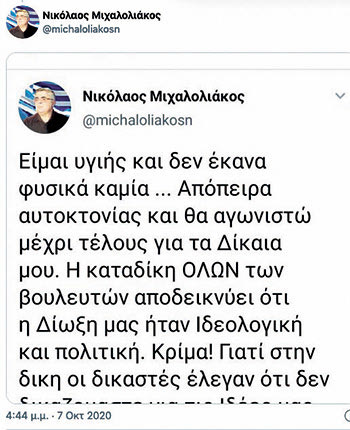 Ο Νίκος Μιχαλολιάκος, όπως όλα τα πολιτικά στελέχη του ναζιστικού μορφώματος, που είναι πια και με τη “βούλα” της ελληνικής Δικαιοσύνης εγκληματική οργάνωση, κρίθηκε ένοχος και για την κατηγορία της διεύθυνσης εγκληματικής οργάνωσης, κάτι που σημαίνει ποινή φυλάκισης από πέντε έως δεκαπέντε χρόνια.