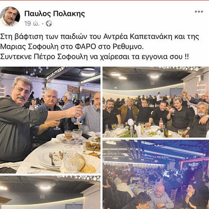 Δεν ξέρω πώς θα καταλήξει ο Πολάκης, αλλά προς το κόμμα είπε πως… δεν ήξερε για τη συνέντευξη του Τσίπρα στο «Πρώτο Θέμα» γι’ αυτό κι έκανε την επίμαχη ανάρτηση. Ο βουλευτής Χανίων ήταν, λέει, καλεσμένος σε βάφτιση που έγινε στο Ρέθυμνο που νονά ήταν η βουλευτής και πρώην υπουργός Όλγα Κεφαλογιάννη. Πήγε, λένε, στην εκκλησία για το μυστήριο και αρχικά ενημέρωσε πως δεν θα πάει στο τραπέζι της βάφτισης, αλλά το πρόγραμμα άλλαξε και τελικά πήγε και στο γλέντι.