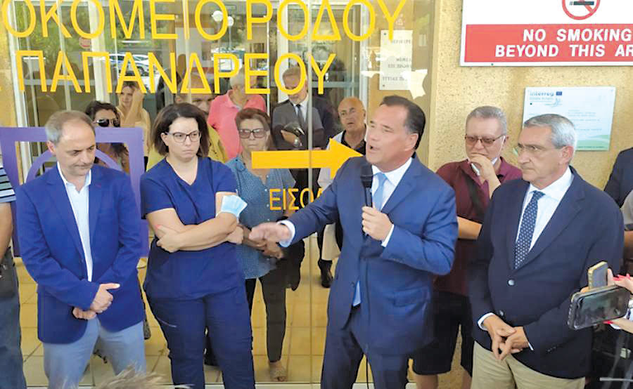 Αποδέκτης των έντονων παραπόνων των εργαζομένων στο νοσοκομείο της Ρόδου έγινε ο υπουργός Υγείας Άδωνις Γεωργιάδης, που στο πλαίσιο της περιοδείας που κάνει στα νοσοκομεία των Δωδεκανήσων επισκέφθηκε χθες το νησί και είχε σειρά συναντήσεων με τις τοπικές αρχές. Το πρωί συναντήθηκε με τον περιφερειάρχη Νοτίου Αιγαίου Γιώργο Χατζημάρκο και με τον δήμαρχο Ρόδου Αλέξανδρο Κολιάδη, συνοδευόμενος από τον βουλευτή Μάνο Κόνσολα, τον διοικητή της 2ης ΥΠΕ Χρήστο Ροϊλό και τον διοικητή του νοσοκομείου Σταύρο Τσαντή. Στη συνέχεια επισκέφθηκε το Νοσοκομείο της Ρόδου. Η υποδοχή περιελάμβανε πανό και συνθήματα, ενώ λίγο αργότερα το κλίμα έγινε εκρηκτικό με φωνές από την πλευρά των εργαζομένων για τις ελλείψεις σε προσωπικό. Πολλές φορές ακούστηκε η λέξη «ντροπή» αλλά και σωρεία παραπόνων για την υποβάθμιση των παροχών υγείας απ’ άκρη σ’ άκρη του νησιού.