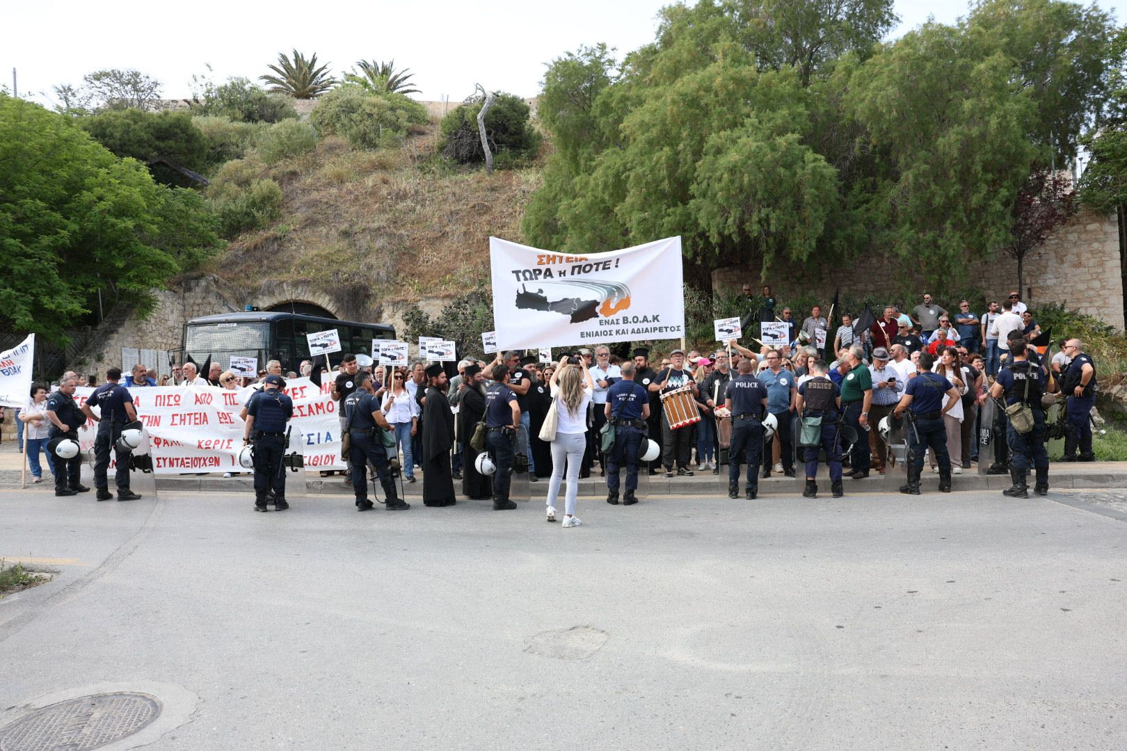 Περιορισμένοι προς την πλευρά του Μαρτινέγκο και περιστοιχισμένοι από άνδρες των ΜΑΤ, διαδήλωσαν περίπου 150 κάτοικοι της Σητείας με επικεφαλής τον Μητροπολίτη Ιεραπύτνης και Σητείας κ. Κύριλλο, τη βουλευτή Λασιθίου του ΠΑΣΟΚ Ελένη Σπυριδάκη και τον δήμαρχο Γιώργο Ζερβάκη. «Κυριάκο θυμήσου την υπόσχεσή σου» ήταν το σύνθημα που κυριάρχησε περιμένοντας τον πρωθυπουργό, αλλά και κατά τη διάρκεια της υπογραφής της σύμβασης, για το τμήμα Χανιά – Ηράκλειο του ΒΟΑΚ, με τον παραχωρησιούχο.