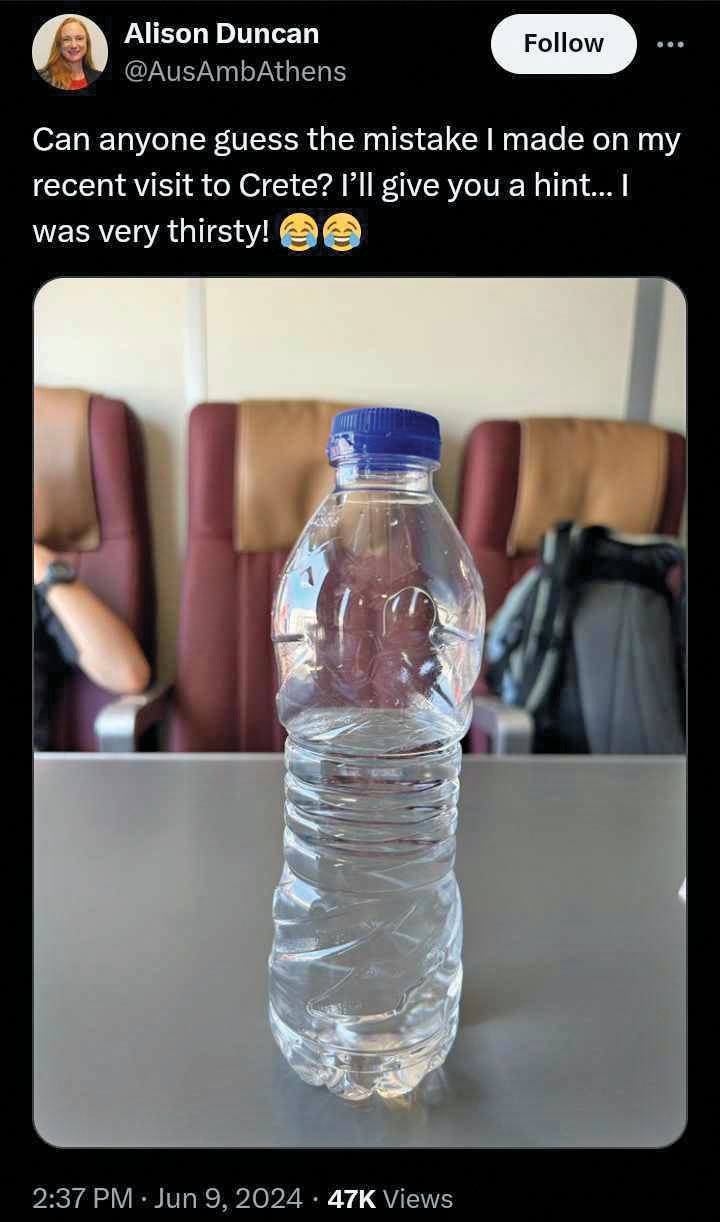 Ποιος από εμάς δεν το έχει πάθει; Η Alison Duncan είναι η πρέσβης της Αυστραλίας στην Ελλάδα και από ό,τι φαίνεται μπέρδεψε το νερό με τη ρακί που της έκαναν δώρο στο νησί. Ήπιε λοιπόν κατά λάθος μια γερή γουλιά για να… ξεδιψάσει! «Μπορεί κάποιος να μαντέψει το λάθος που έκανα στην πρόσφατή μου επίσκεψη στην Κρήτη; Σας δίνω ένα… ίχνος ήμουν πολύ διψασμένη!» έγραψε χθες ξεκαρδισμένη η κ. Duncan, δείχνοντας τη φωτογραφία με το μισοάδειο μπουκαλάκι του νερού με το παραδοσιακό μας ποτό. Αν μη τι άλλο, η κυρία πρέσβης έχει χιούμορ!