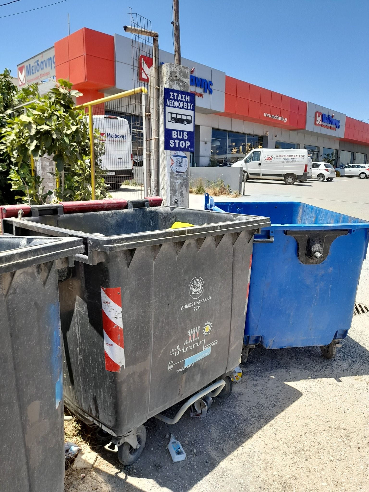 Σετάκι με τη στάση του λεωφορείου η εγκατάσταση των κάδων απορριμμάτων, στη λεωφόρο 62 Μαρτύρων. Φανταστείτε τι συμβαίνει όταν οι κάδοι γεμίσουν και ο κόσμος περιμένει το αστικό για να επιβιβαστεί… Δεν περιγράφεται…
