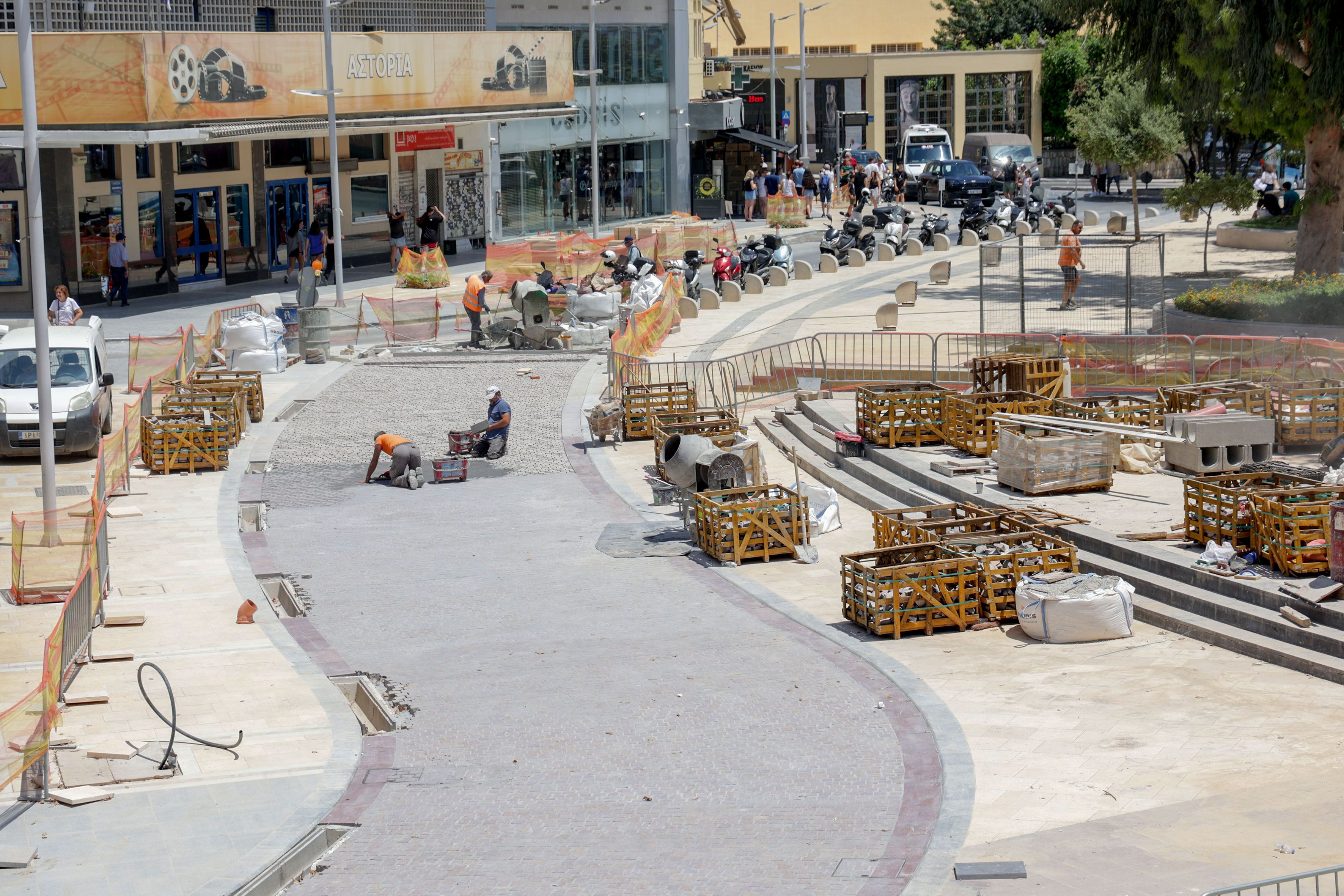 Προχωρά η αποκατάσταση της πλατείας Ελευθερίας, αλλά τελικά δεν τελειώνει. Το κεντρικό της κομμάτι, όπως βλέπουμε και στην φωτογραφία, είναι σχεδόν ολοκληρωμένο· ωστόσο, η πλευρά, που βρίσκεται προς τη λεωφόρο Δικαιοσύνης, δουλεύεται ακόμα. Κι αν κρίνουμε από την εικόνα που βλέπουμε, δεν προβλέπεται να ολοκληρωθεί ούτε σήμερα, ούτε αύριο. Μια επισήμανση μόνο: Η τουριστική σεζόν βρίσκεται σε εξέλιξη και η πλατεία Ελευθερίας είναι στο κεντρικότερο σημείο της πόλης του Ηρακλείου.