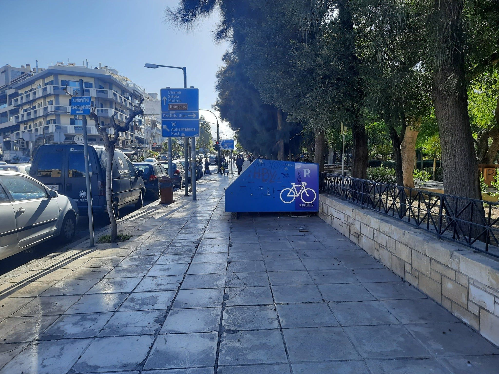 Εδώ και καιρό τοποθετήθηκαν στο Ηράκλειο τα εικονιζόμενα μεταλλικά, ογκώδη μπλε κουτιά, με σκοπό να λειτουργήσουν ως ασφαλή πάρκινγκ ποδηλάτων. Ως εδώ καλά. Όπως όμως μας αναφέρει αναγνώστρια της στήλης: «Πιάνουν πολύ -από τον περιορισμένο ελεύθερο- χώρο της πόλης και δεν προσφέρουν στην αισθητική της.