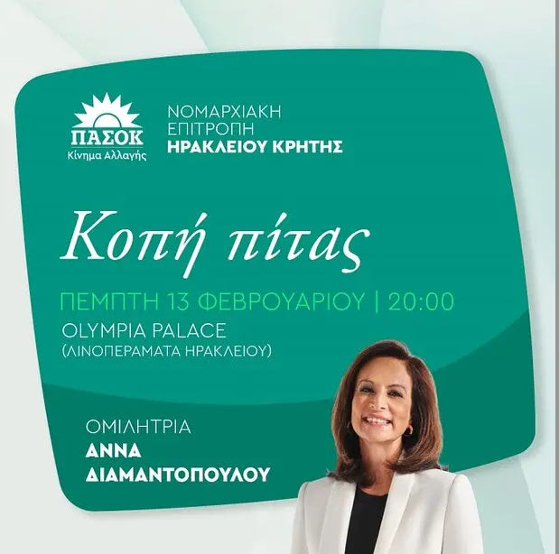 Μάλιστα ο Ν. Ανδρουλάκης αναγνωρίζοντας την εμπειρία της αλλά και το πολιτικός της βάρος, την όρισε υπεύθυνη του Πολιτικού Σχεδιασμού του ΠΑΣΟΚ. Με την ιδιότητα αυτή και φυσικά του κορυφαίου στελέχους, θα είναι το κεντρικό πρόσωπο στην αποψινή εκδήλωση του τοπικού ΠΑΣΟΚ, για την κοπή της πρωτοχρονιάτικης πίτας.