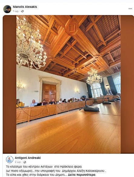 …Αλλά από την αντιπαράθεση αυτή βγήκε και μια άλλη είδηση. Πιο… κοινωνική, θα έλεγα. Τη σφοδρή κριτική που έκανε στη δημοτική αρχή του Καλοκαιρινού για το Κέντρο Αστέγων η Αντιγόνη Ανδρεάκη όχι μόνο την επικρότησε, αλλά και την αναπαρήγαγε ο μέχρι πρότινος στενός συνεργάτης του δημάρχου, ο Μανόλης Αλεξάκης! Τι σημαίνει αυτό; Μπορεί τίποτα, μπορεί και πολλά! Σίγουρα δείχνει ότι δεν έφυγε με την καλύτερη διάθεση από τον Δήμο!