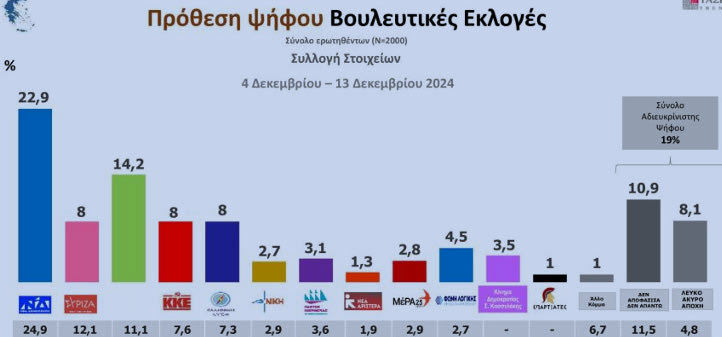 Σταθερό προβάδισμα της ΝΔ δίνουν οι τάσεις της MRB. Συγκεκριμένα στην πρόθεση ψήφου, η ΝΔ καταγράφει ποσοστό 22,9% και ακολουθεί το ΠΑΣΟΚ-ΚΙΝΑΛ με 14,2%.