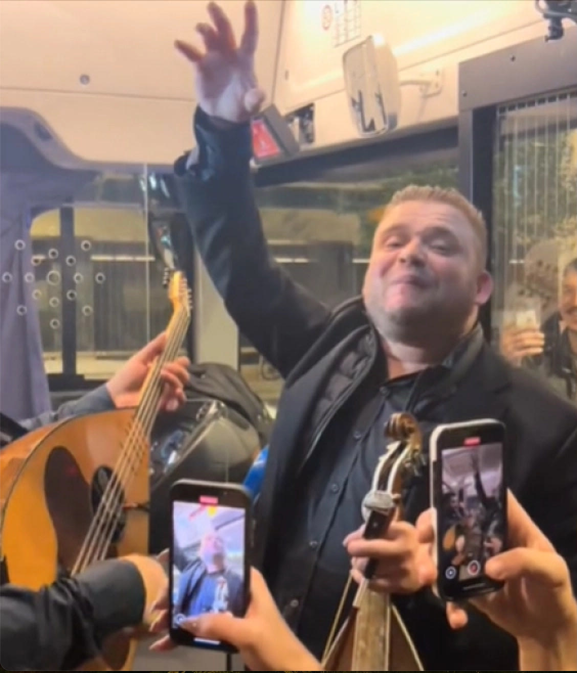 Παράλληλα σταμάτησαν και ένα αστικό λεωφορείο για να κεράσουν τους επιβάτες ρακή και να τραγουδήσουν μαζί τους.