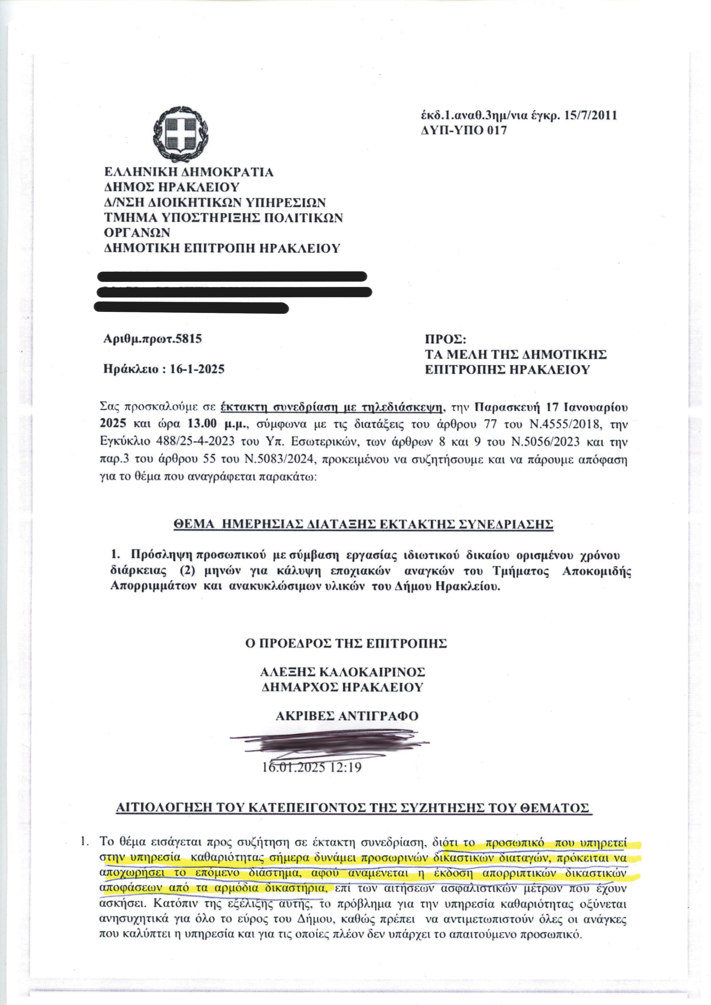 Όπως αναφέρεται στη σχετική εισήγηση που αφορά στην πρόσληψη, «το θέμα εισάγεται προς συζήτηση σε έκτακτη συνεδρίαση διότι το προσωπικό που υπηρετεί στην υπηρεσία καθαριότητας σήμερα, δυνάμει προσωρινών δικαστικών διαταγών, πρόκειται να αποχωρήσει το επόμενο διάστημα, αφού αναμένεται η έκδοση απορριπτικών δικαστικών αποφάσεων από τα αρμόδια δικαστήρια επί των αιτήσεων ασφαλιστικών μέτρων που έχουν ασκήσει».