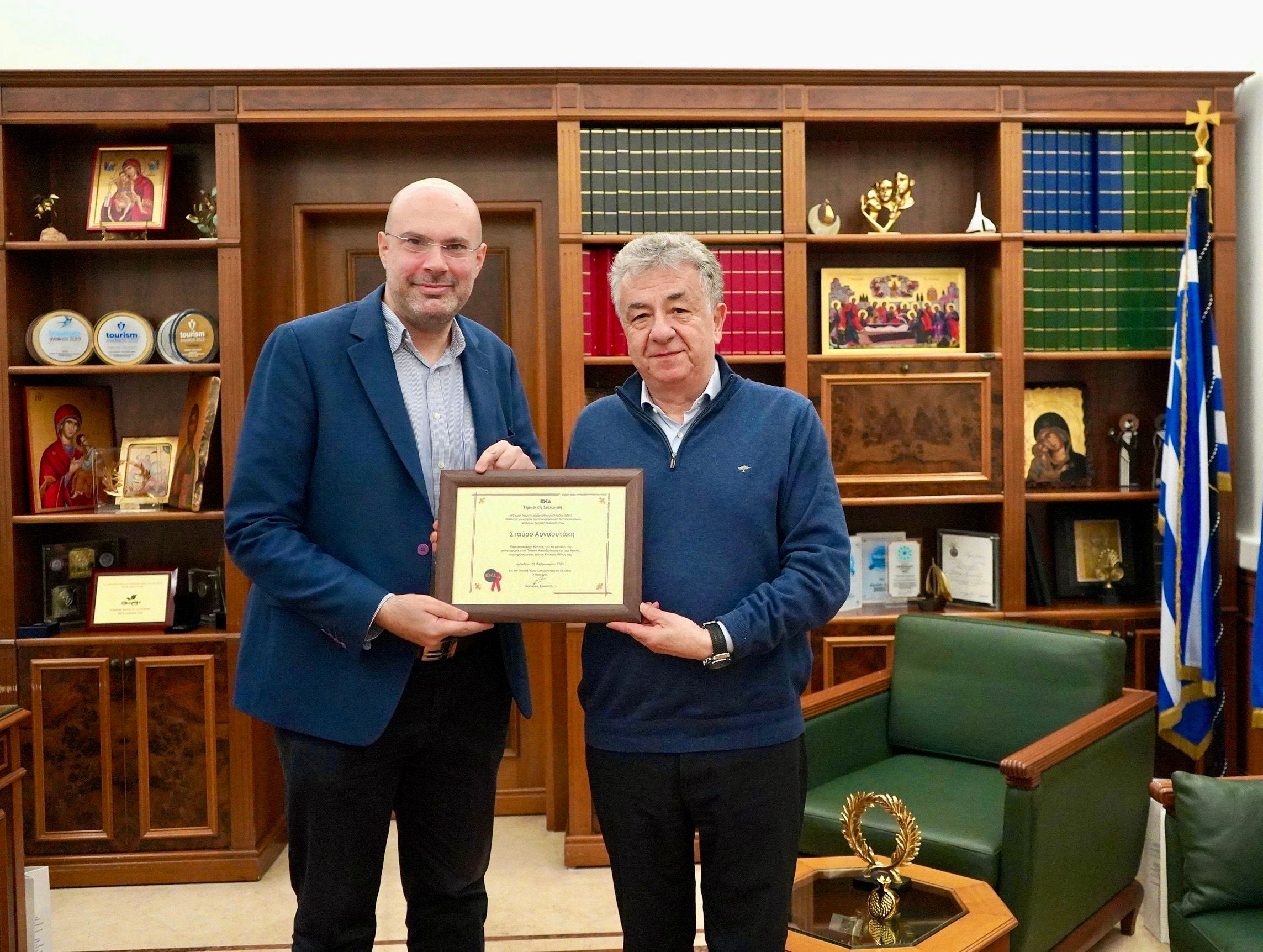 Ο κ. Καλαντζής στο πλαίσιο της επίσκεψής του στην Περιφέρεια ενημέρωσε τον κ. Αρναουτάκη για τις δράσεις της Ε.Ν.Α. ανά την Ελλάδα, και τον βράβευσε για την συνολική του προσφορά στην Ελληνική Τοπική Αυτοδιοίκηση. Παράλληλα, ανακήρυξε τον περιφερειάρχη Κρήτης σε επίτιμο μέλος της Ε.Ν.Α.