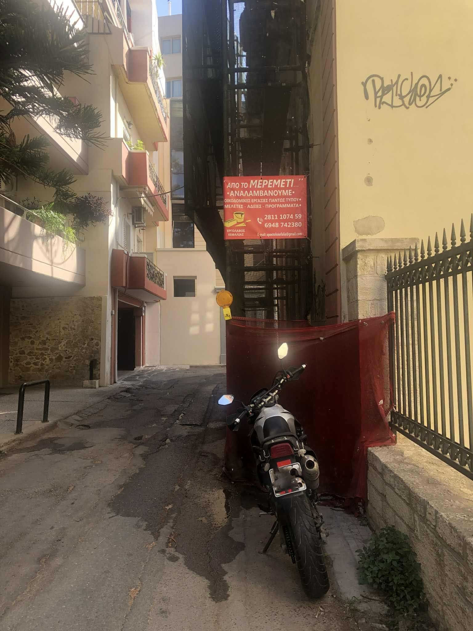 Τουλάχιστον 6 χρόνια τώρα, στην γωνία της οδού Αριάδνης πίσω ακριβώς από το ξενοδοχείο Ατλαντίς, σκαλωσιές και λινάτσες, τυλίγουν το «νεοκλασικό Διαλυνά», που έχει αλλάξει χέρια, αλλά παρουσιάζει ετοιμορροπίες, κυρίως στα μπαλκόνια του.