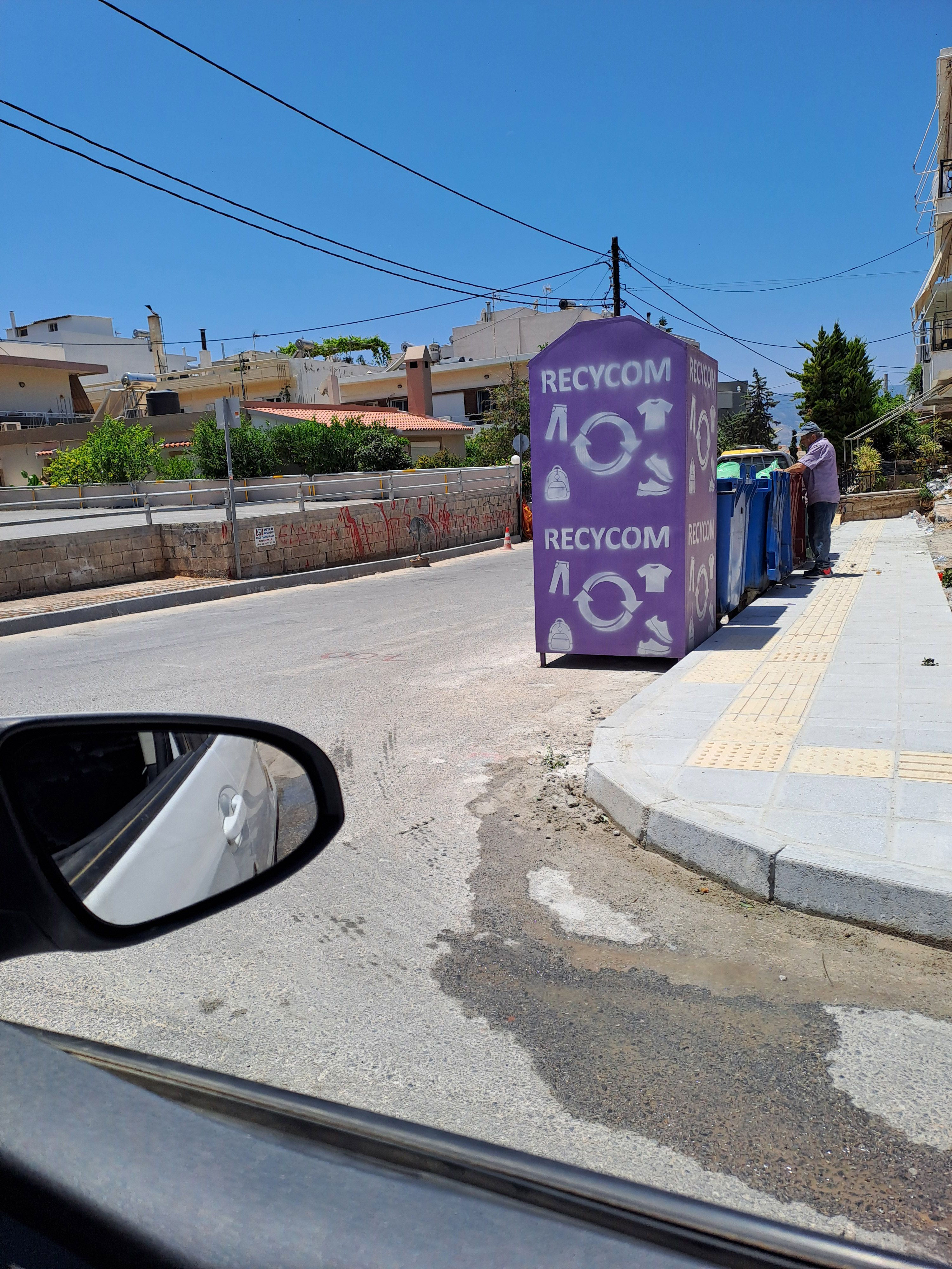 Στο ίδιο δε σημείο, στη συμβολή της Φοίνικος με την Ηρακλή, τα πράγματα γίνονται ακόμα πιο δύσκολα, όπως φαίνεται στη φωτογραφία. Οι κάδοι απορριμμάτων και ο οικίσκος εναπόθεσης ρούχων βγήκαν εκτός πεζοδρομίων, περιορίζοντας την ορατότητα των οδηγών που στρίβουν, με σοβαρό τον κίνδυνο ατυχήματος.