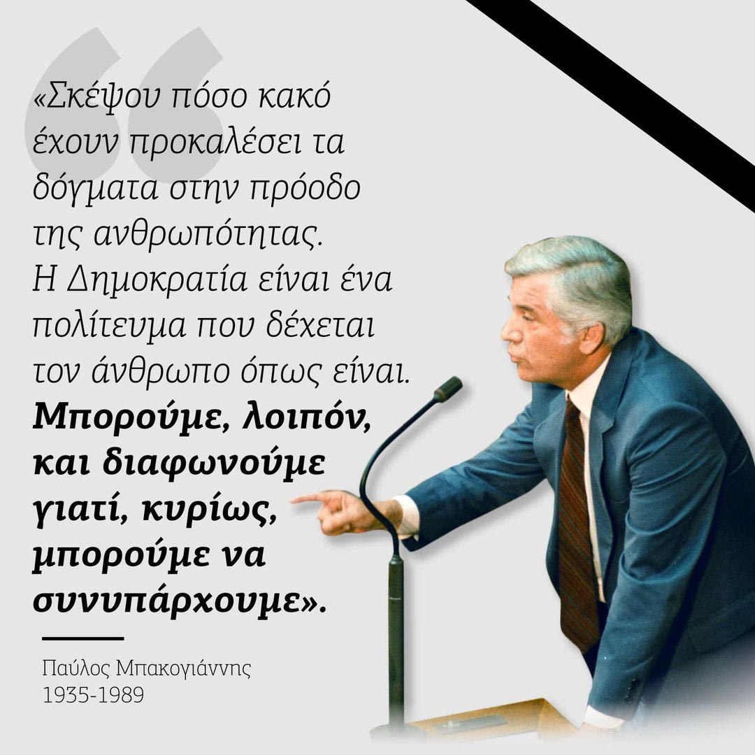 «Εδώ και 35 χρόνια τα λόγια νικούν και θα νικούν τις άνανδρες σφαίρες», σημειώνει ο πρωθυπουργός, Κυριάκος Μητσοτάκης, αναφερόμενος στη συμπλήρωση 35 ετών από τη δολοφονία του Παύλου Μπακογιάννη από την τρομοκρατική οργάνωση «17 Νοέμβρη». Ο κ. Μητσοτάκης, σε ανάρτηση όπου παρέθεσε λόγια του Παύλου Μπακογιάννη, ο οποίος σημείωνε, μεταξύ άλλων, ότι «μπορούμε λοιπόν και διαφωνούμε γιατί, κυρίως μπορούμε να συνυπάρχουμε», τόνισε: «Τα λόγια του Παύλου ισχύουν όσο ποτέ, καθώς δικαιώνονται στον χρόνο. Γίνονται προσωπική πυξίδα όσων ζήσαμε μαζί του. Και οδηγός στη δράση κάθε ελεύθερου πολίτη. Εδώ και 35 χρόνια νικούν και θα νικούν τις άνανδρες σφαίρες».